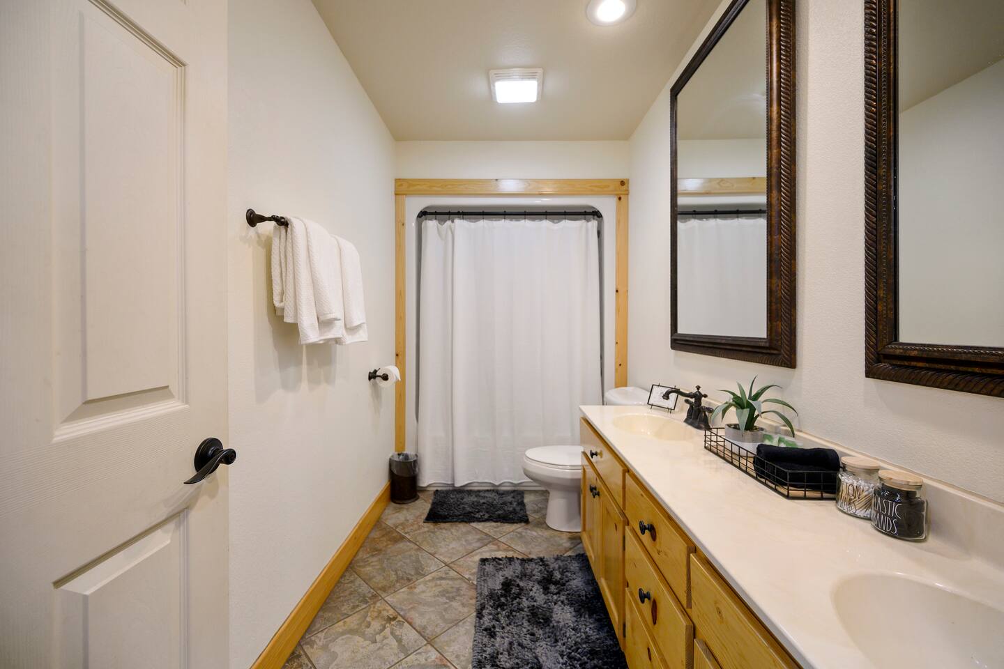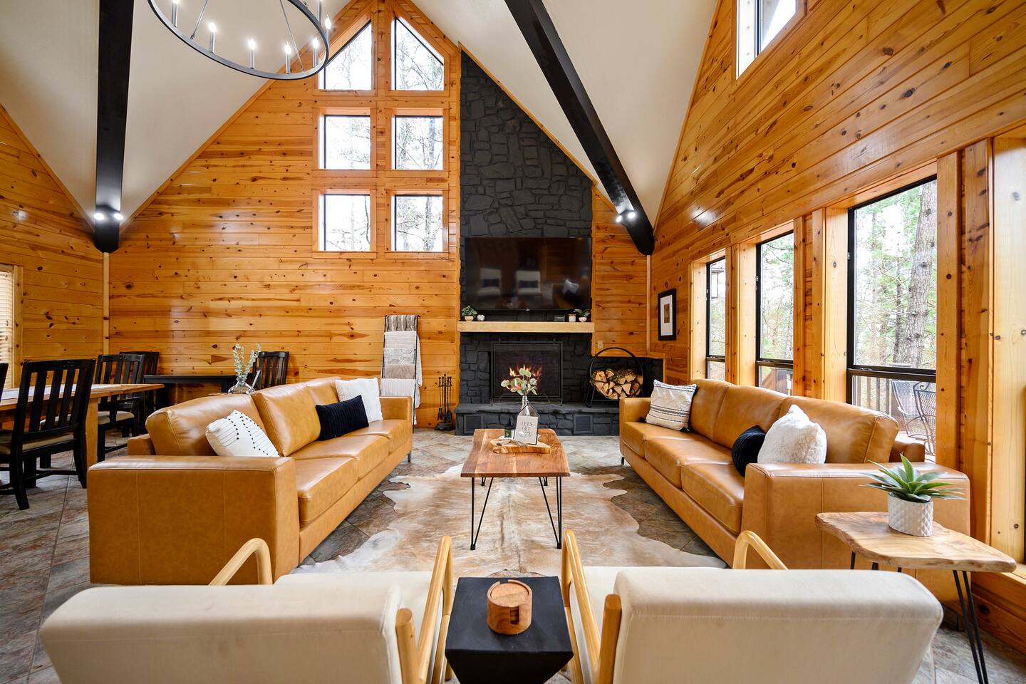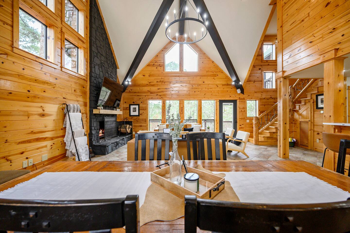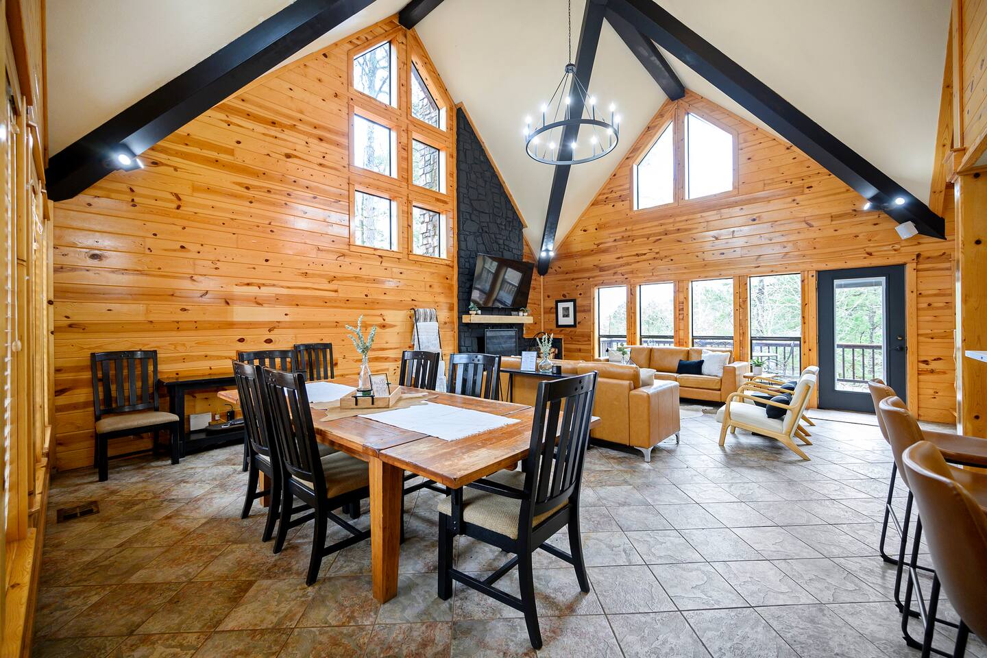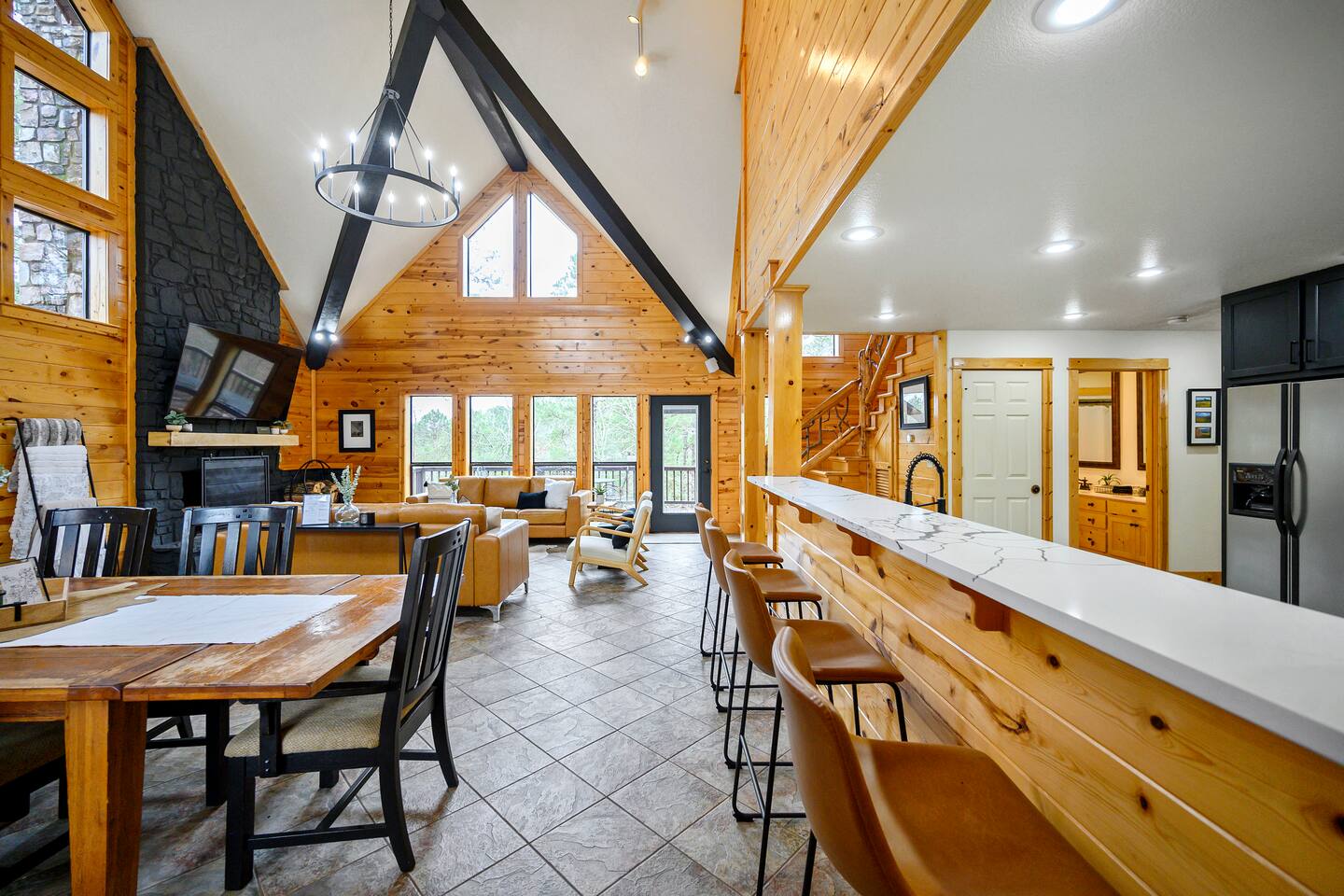 Relax with the whole family at this beautiful & peaceful cabin! This updated cabin offers 4 large rooms with 7 beds & 3 full bathrooms. 3 rooms that each have 1 queen bed & 1 room with 2 sets of full size bunk beds. Open living/dining/kitchen area is great for enjoying time together. The master has a private patio with sitting area. Off the living room you will find a huge second story deck with dining area & hot tub. On the lower level you find the fire pit, outdoor seating & horse shoe pit!
