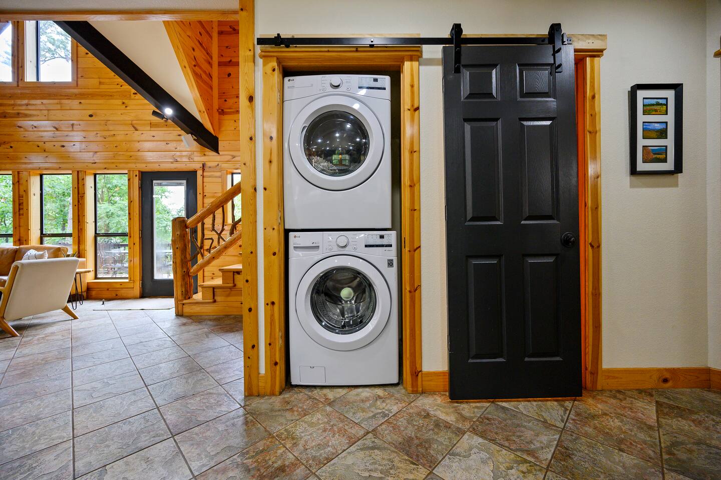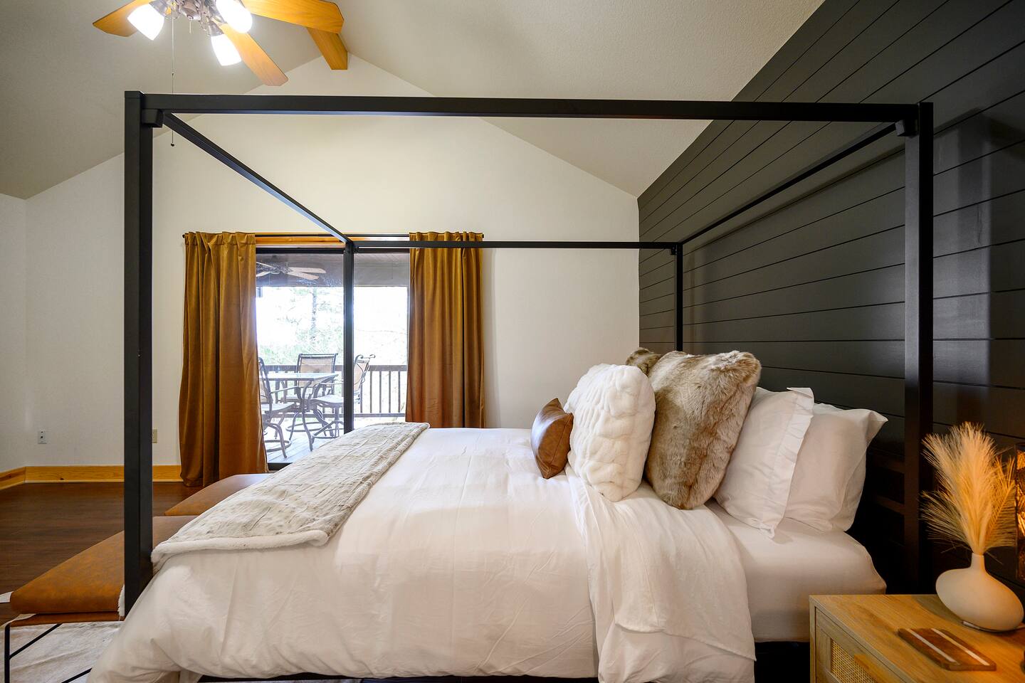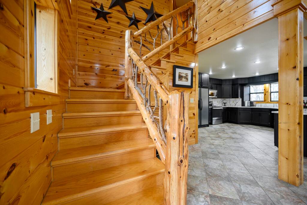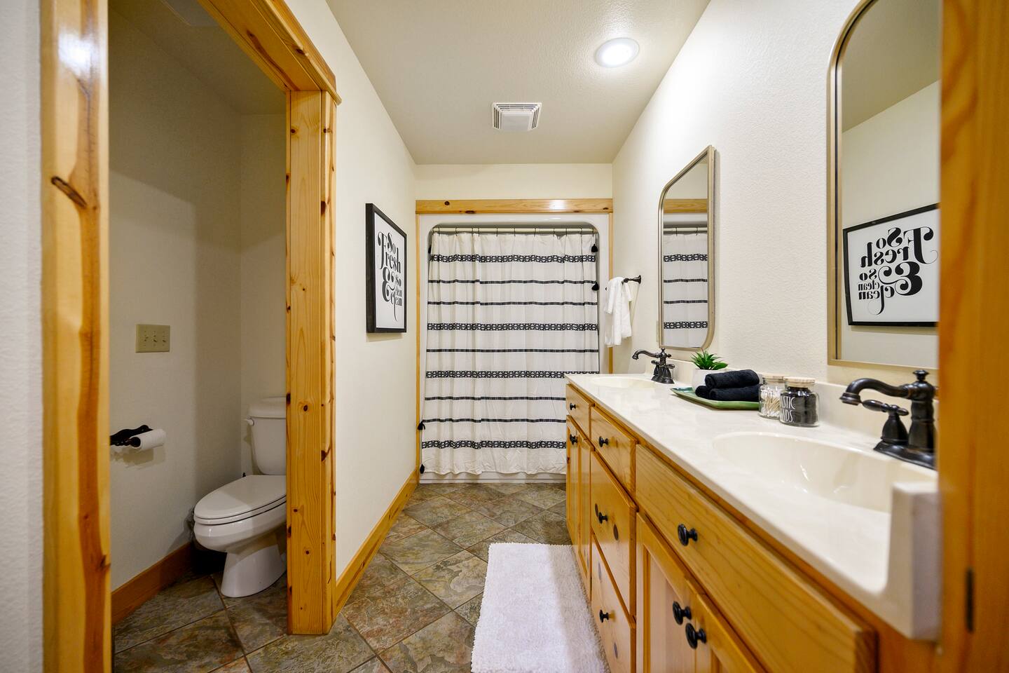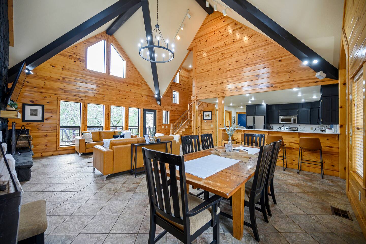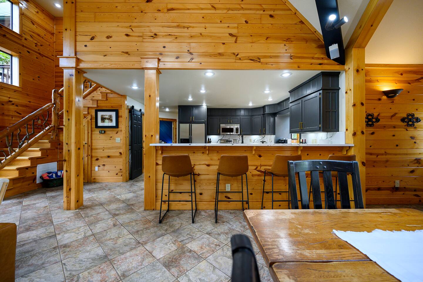 Relax with the whole family at this beautiful & peaceful cabin! This updated cabin offers 4 large rooms with 7 beds & 3 full bathrooms. 3 rooms that each have 1 queen bed & 1 room with 2 sets of full size bunk beds. Open living/dining/kitchen area is great for enjoying time together. The master has a private patio with sitting area. Off the living room you will find a huge second story deck with dining area & hot tub. On the lower level you find the fire pit, outdoor seating & horse shoe pit!