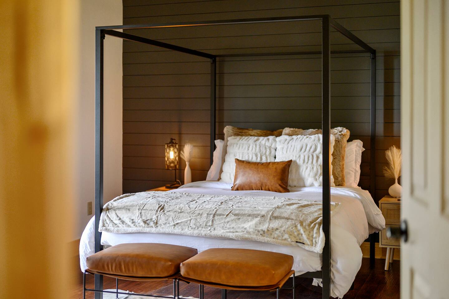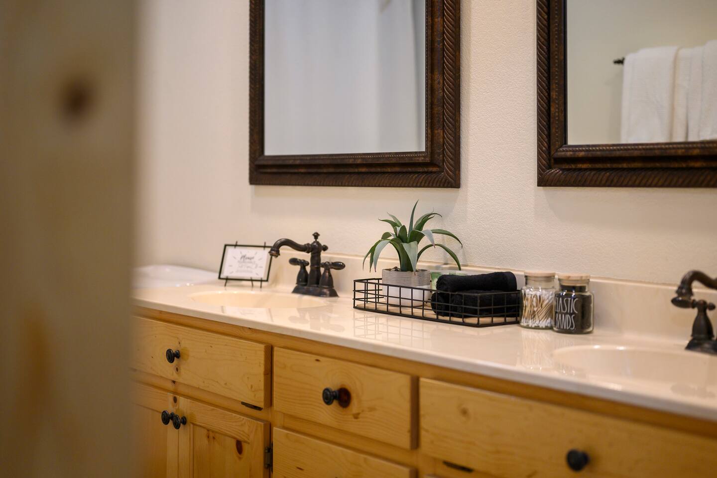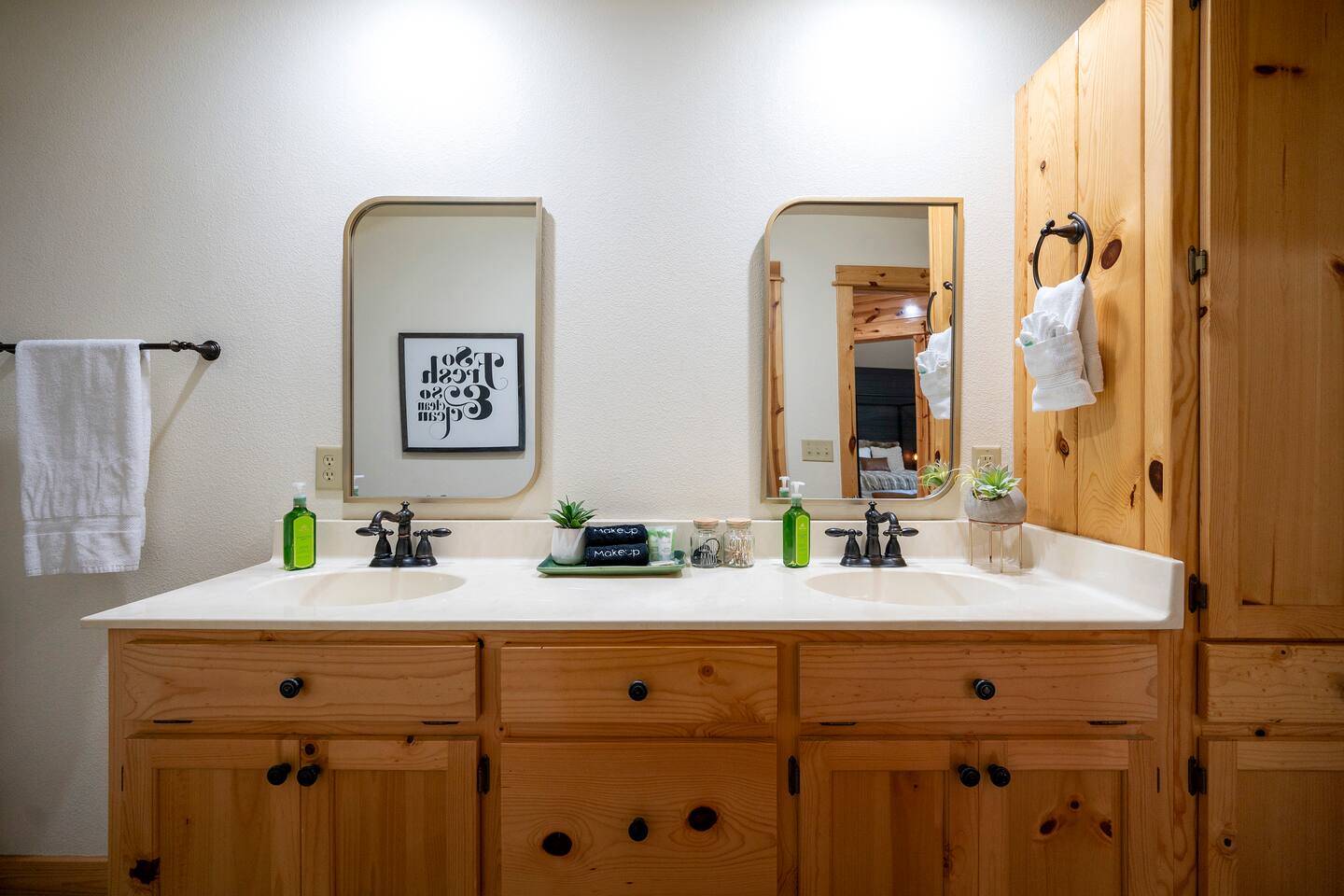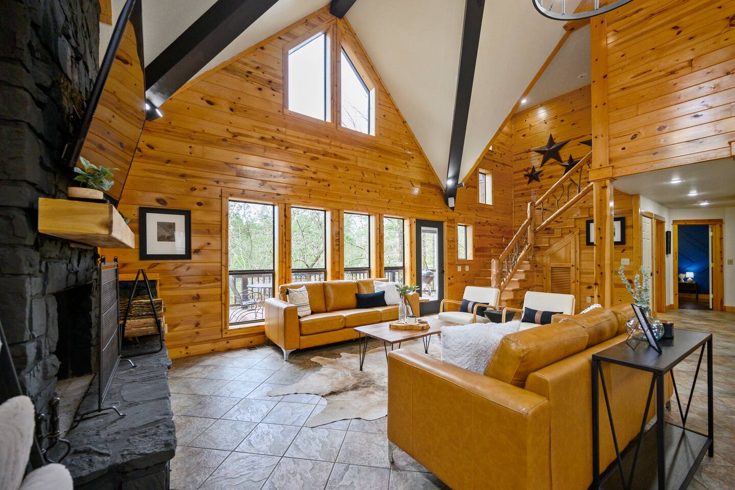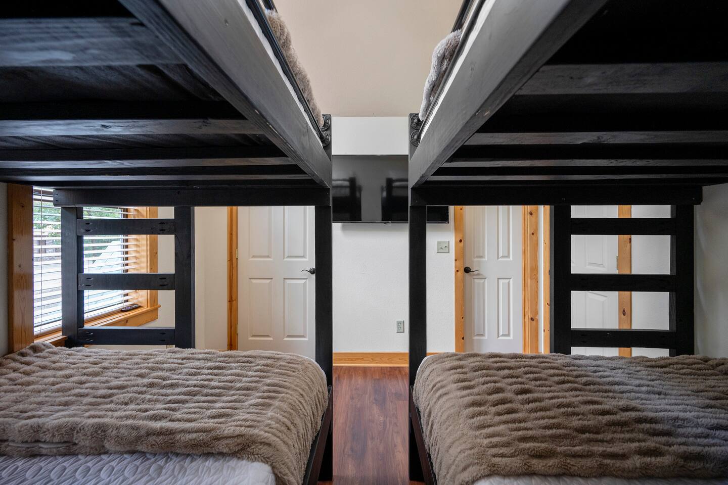 This cabin offers 4 large rooms with 7 beds & 3 full bathrooms. 3 rooms that each have 1 queen bed & 1 room with 2 sets of full size bunk beds. In addition to the beds there is two couches and two full size blow up mattress with bedding provided if needed for additional sleeping arrangements.